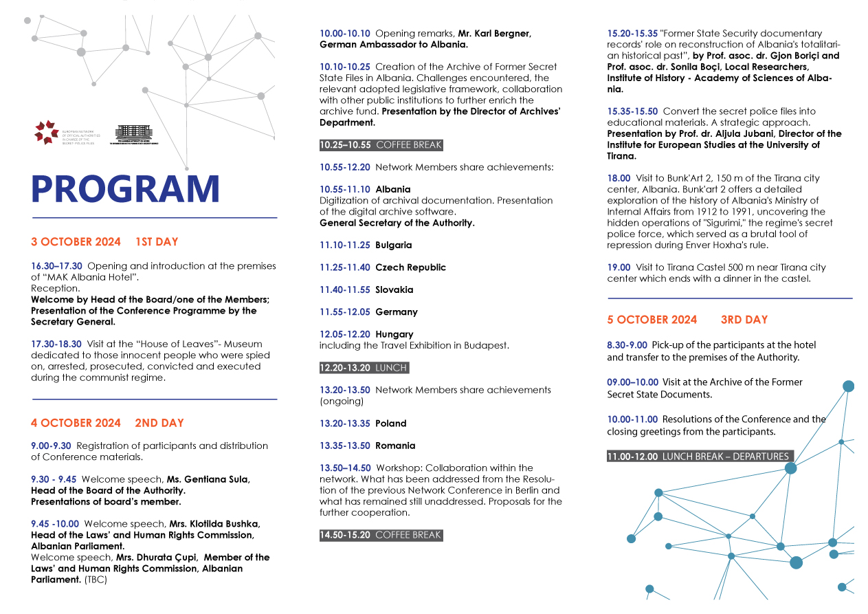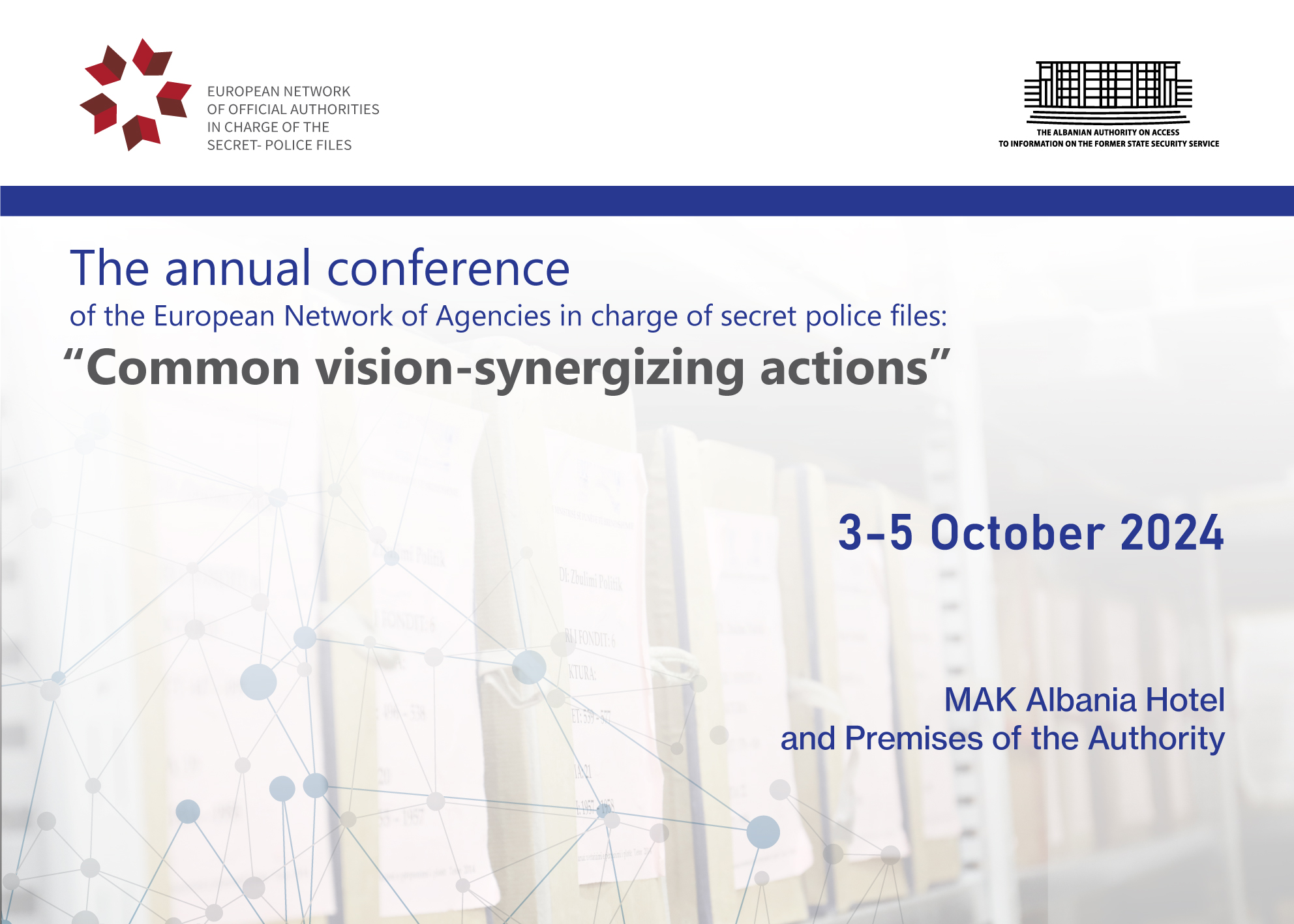 Konferenca, e cila për herë të parë organizohet në Shqipëri, zhvillohet me temën “Vizion i përbashkët – veprime sinergjike” dhe përfshin fjalime nga znj. Gentiana Sula, Kryetare e Bordit të Autoritetit, z. Karl Bergner, Ambasadori i Gjermanisë në Shqipëri, si dhe përfaqësues nga Kuvendi i Shqipërisë. Në fokus të diskutimeve është krijimi i arkivës së dokumenteve të Ish-Sigurimit të Shtetit në Shqipëri, si dhe arritjet në fushën e digitalizimit të këtij dokumentacioni.