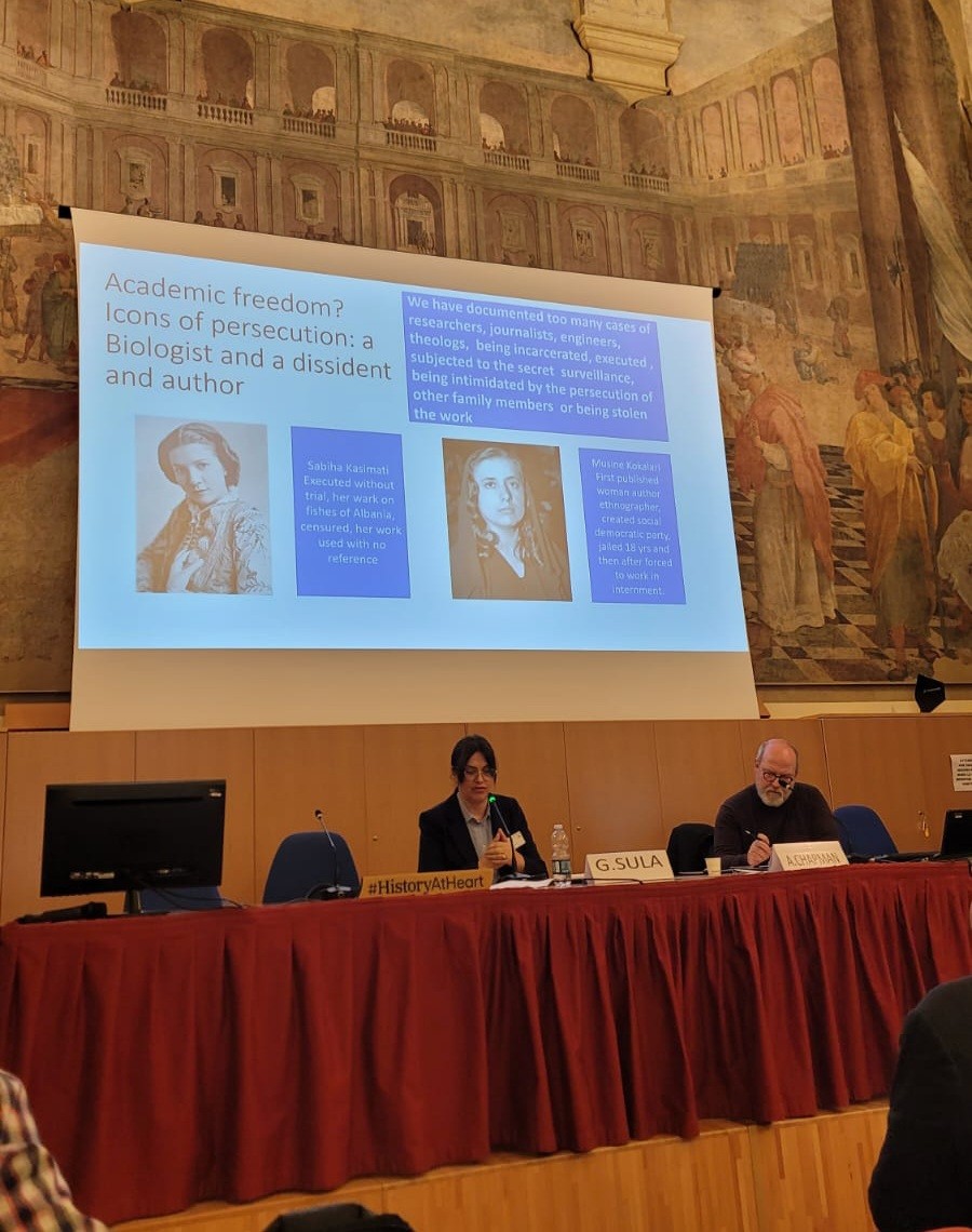 Më tej Dr. Gentiana Sula vijoi me vështrimin mbi filtrat e përdorur nga politika dhe kërcënimet ndaj lirisë akademike, sfidat për të njohur të shkuarën përmes qasjes në burime dhe mendimit kritik; ndarja e akademisë nga mësimdhënia si dhe përplasja e narrativave mbi historinë e së shkuarës me ndikim në shoqëri.